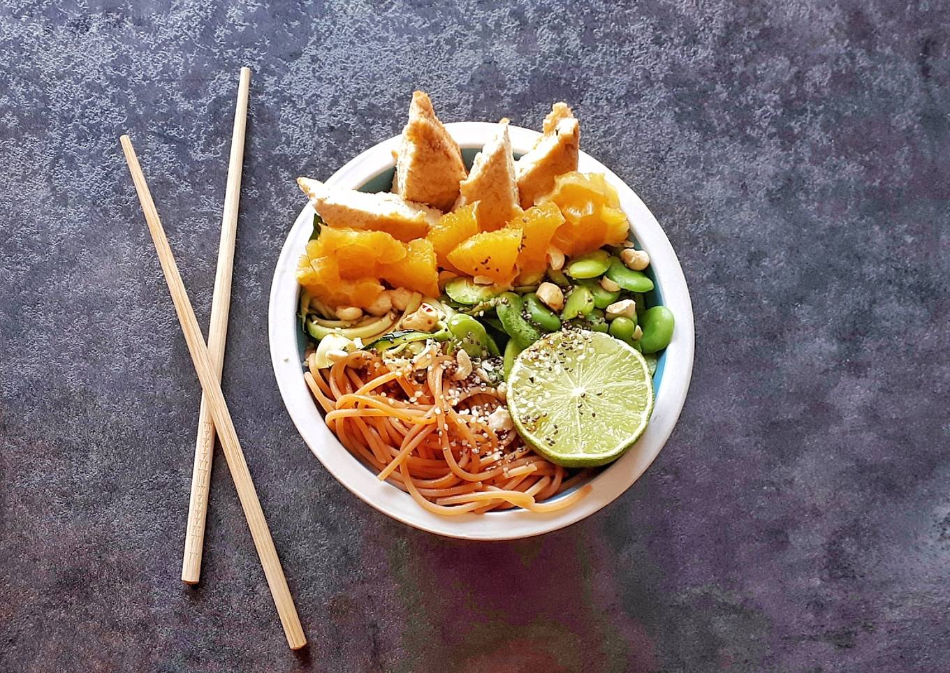 - Égouttez les pâtes, et répartissez ces dernières dans le bol avec la courgette et les fèves. Placez le tofu, les quartiers d'oranges.