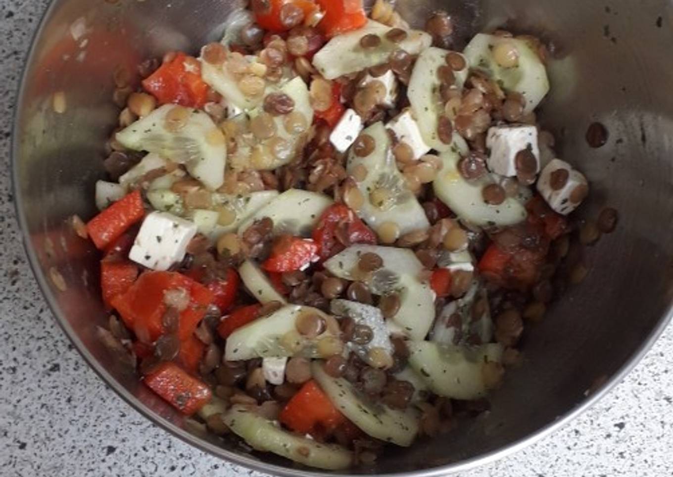 - Pendant que les lentilles cuisent, découper le poivron, le concombre, les tomate cerise, la fêta et le persil puis mélangé le tout dans un saladier