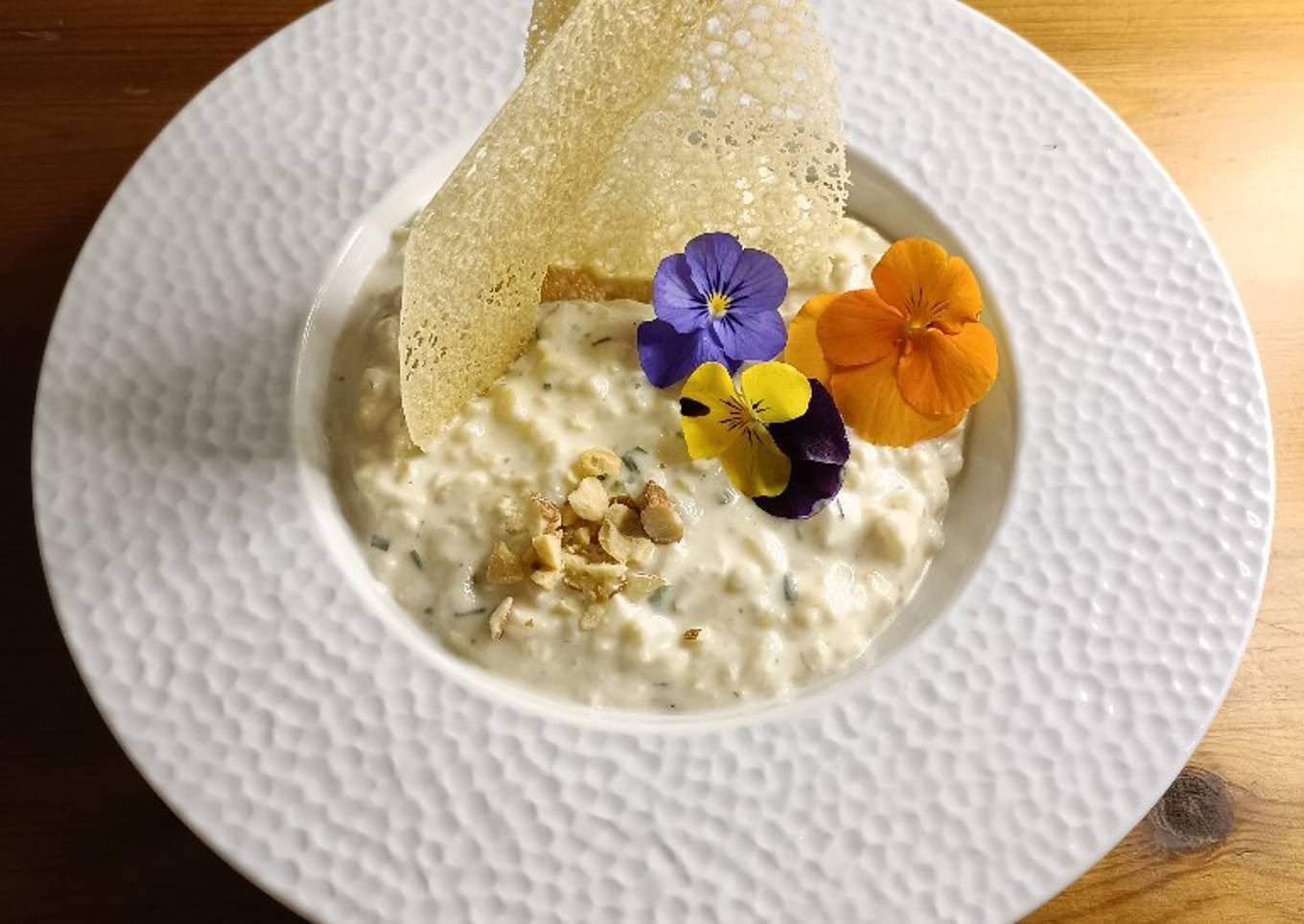 - Dresse dans une assiette creuse le risotto, ajoute les deux tuiles de pain et pour terminer par les fleurs comestibles.