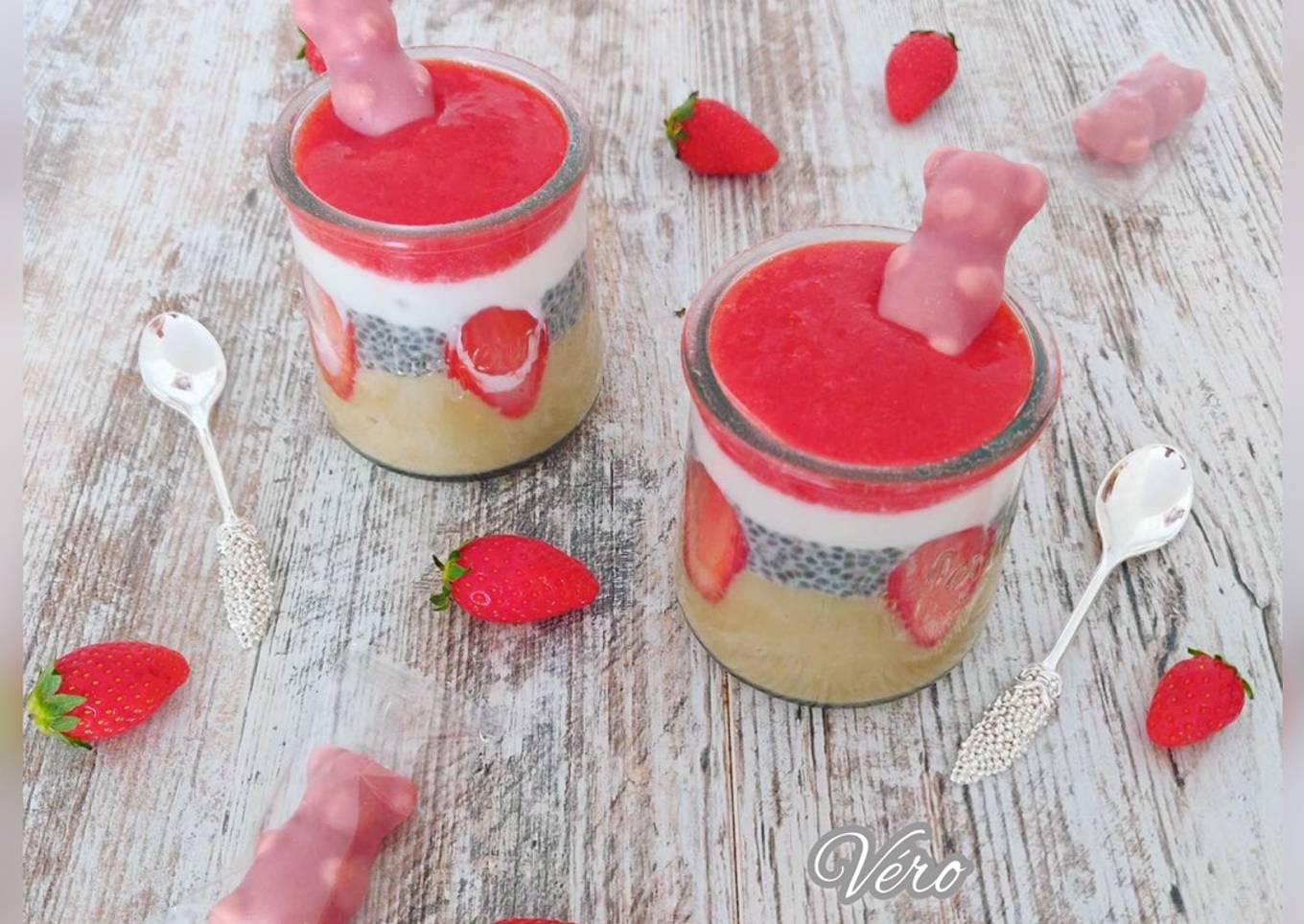- Le lendemain, dresser les verrines en alternant une couche de compote de rhubarbe, une de chia, une de fromage blanc