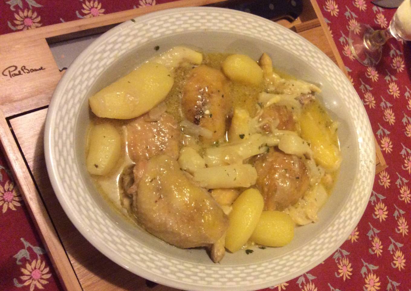 - Faire blondir les échalotes puis les cuisses de poulet (vous pouvez les couper à la jointure pour que ce soit plus facile a retourner dans la cocote). Quand le tout est légèrement doré verser le bouillon. Porter à ébullition et laissez mijoter pendant 30 minutes.