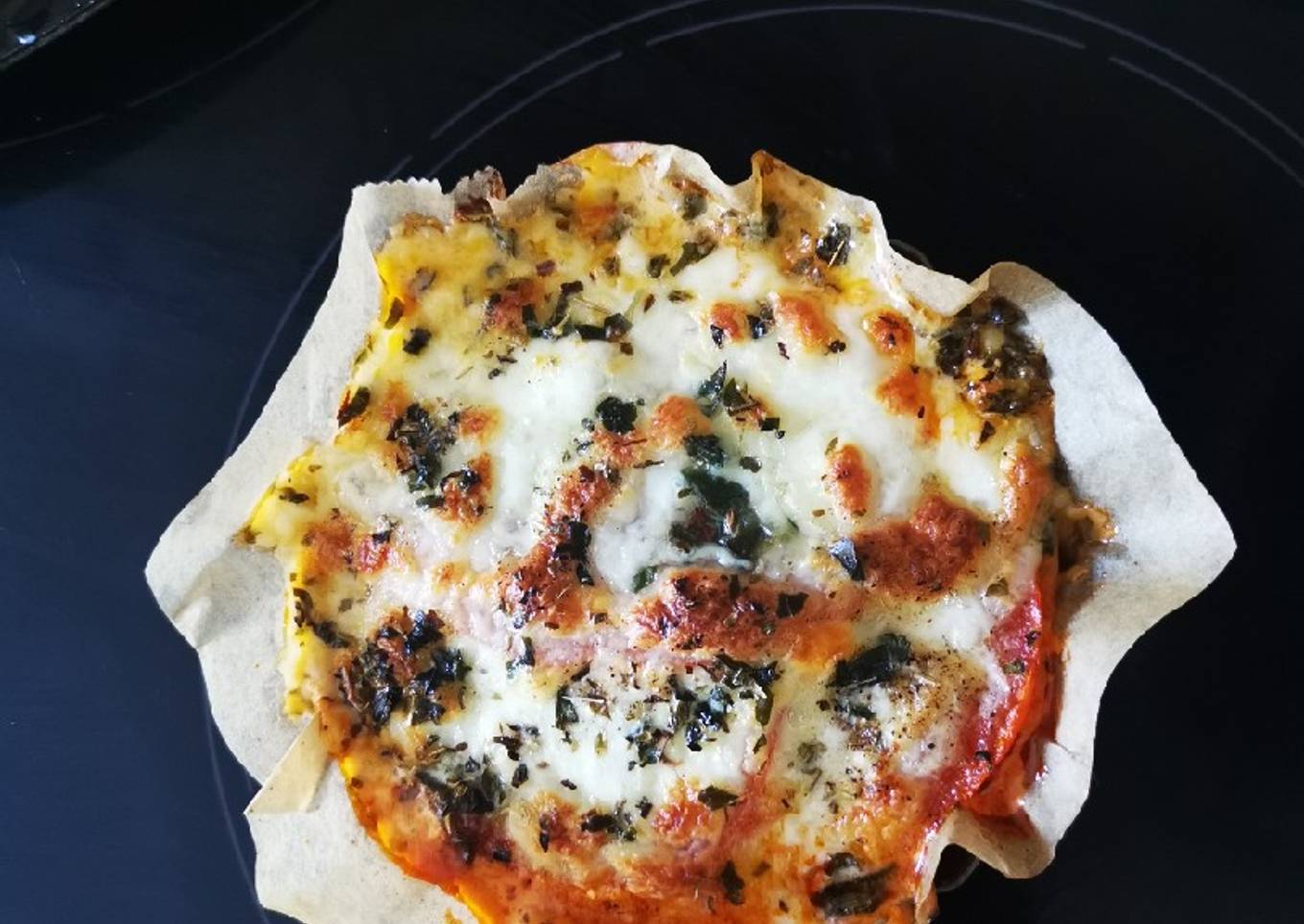 - Étaler la pâte dans un moule. Garnir avec d'abord un fond de crème fraîche, recouvrir de sauce, ajouter 3 rondelles de tomates chevauchées par tartelette, couper des Tranches de mozza et les repartir généreusement sur les tartelettes. Saupoudrer de basilic et sel poivre.