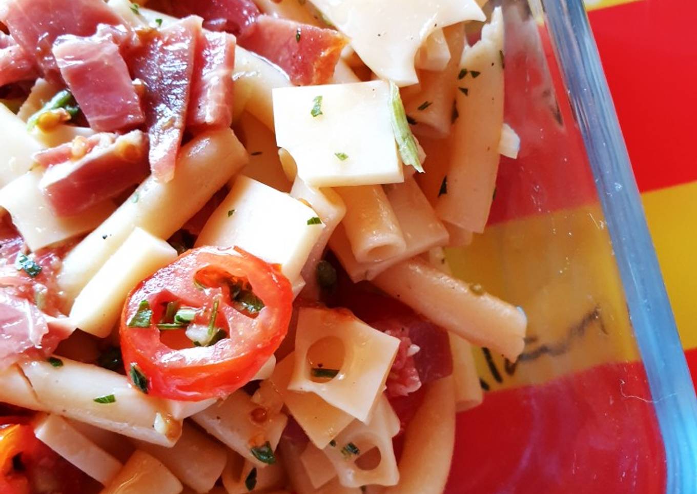 - Couper en carré le fromage en tranche, la mozzarella le jambon cru, les tomates 🍅 cerises en tranches également. Ajouter le tout dans un saladier avec les pâtes froides. Ajouter l'huile d'olive le vinaigre sel et poivre. Mélanger le tout.
